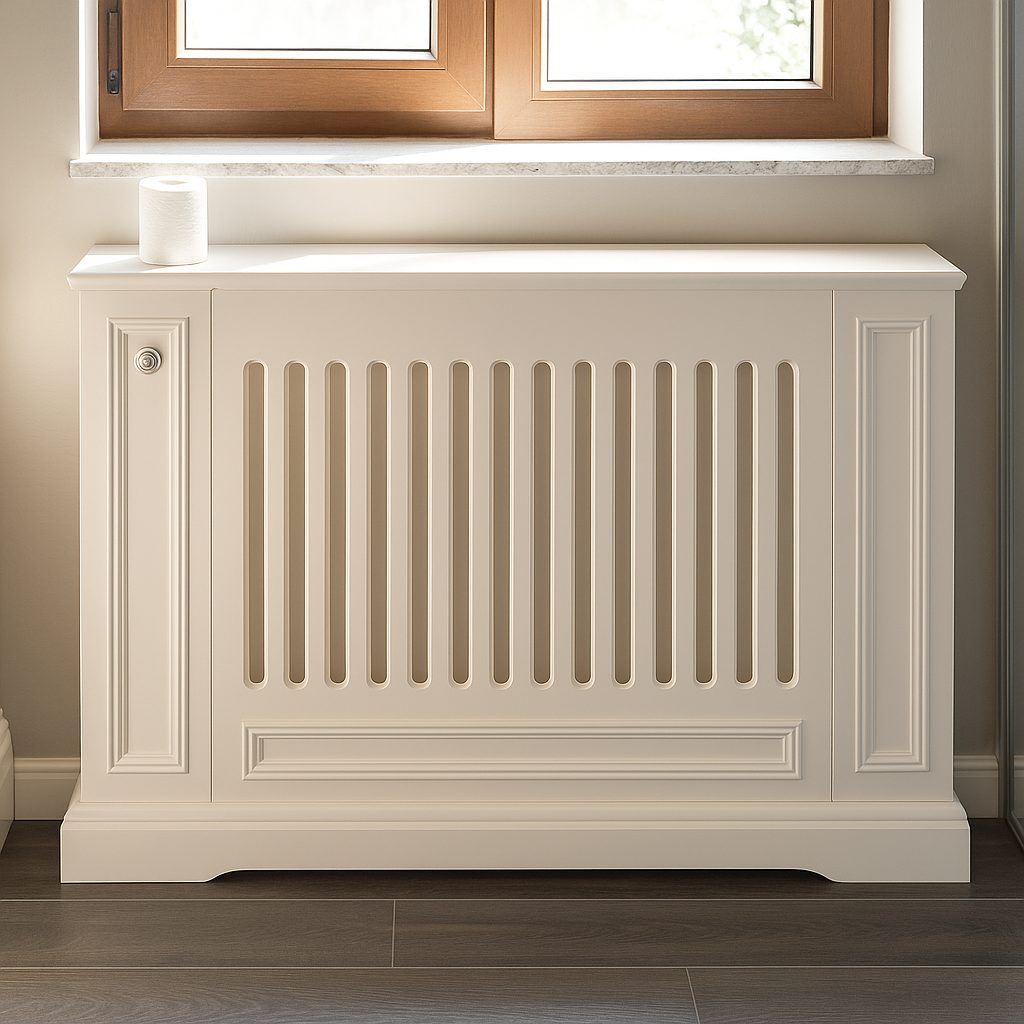 Pe peretele opus a fost montată o mască de calorifer din MDF vopsit la comandă, cu grilaj vertical frezat pentru ventilație eficientă și panouri laterale decorative. Aceasta păstrează continuitatea estetică și asigură acces ușor la sistemul de încălzire, fiind complet demontabilă.