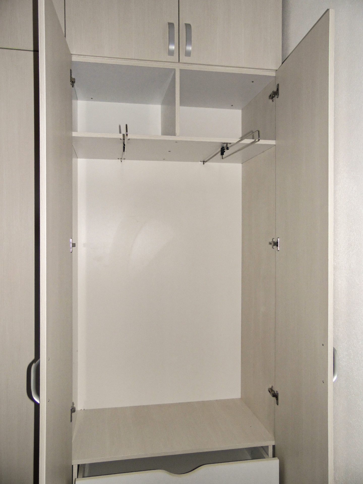 Una dintre provocările frecvente în holuri este adâncimea redusă a spațiului disponibil. Pentru a asigura o depozitare corectă a hainelor pe umeraș, am integrat soluții ingenioase, precum bara de haine cu extracție. Acest mecanism permite aranjarea frontală a umerașelor, oferind acces deplin și vizibilitate crescută, chiar și într-un corp de mobilier mai îngust. Astfel, fiecare haină este ușor de găsit și de așezat la loc, transformând un gest zilnic într-o experiență plăcută și firească, fără compromisuri.