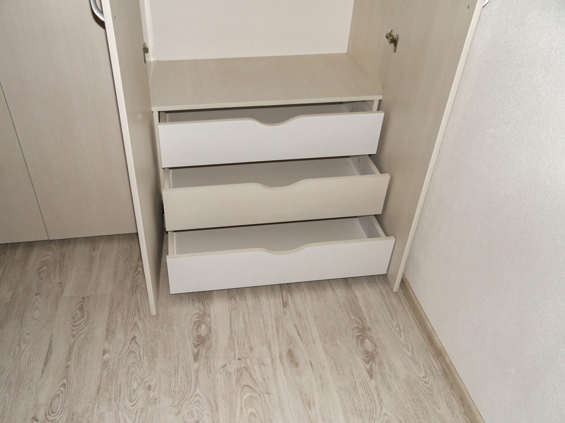 Armonia unui proiect stă adesea în detaliile tehnice. În interiorul acestui dressing am prevăzut trei sertare generoase, ideale pentru a organiza accesoriile mici. Alegerea mânerelor decupate direct în frontul sertarelor are un dublu rol. Pe de o parte, păstrează o linie vizuală curată. Pe de altă parte, este o decizie esențială care permite închiderea perfectă a ușilor, fără ca mânerele acestora să lovească sertarele. Astfel, am putut păstra adâncimea maximă a fiecărui sertar, fără a irosi niciun centimetru prețios din interior.